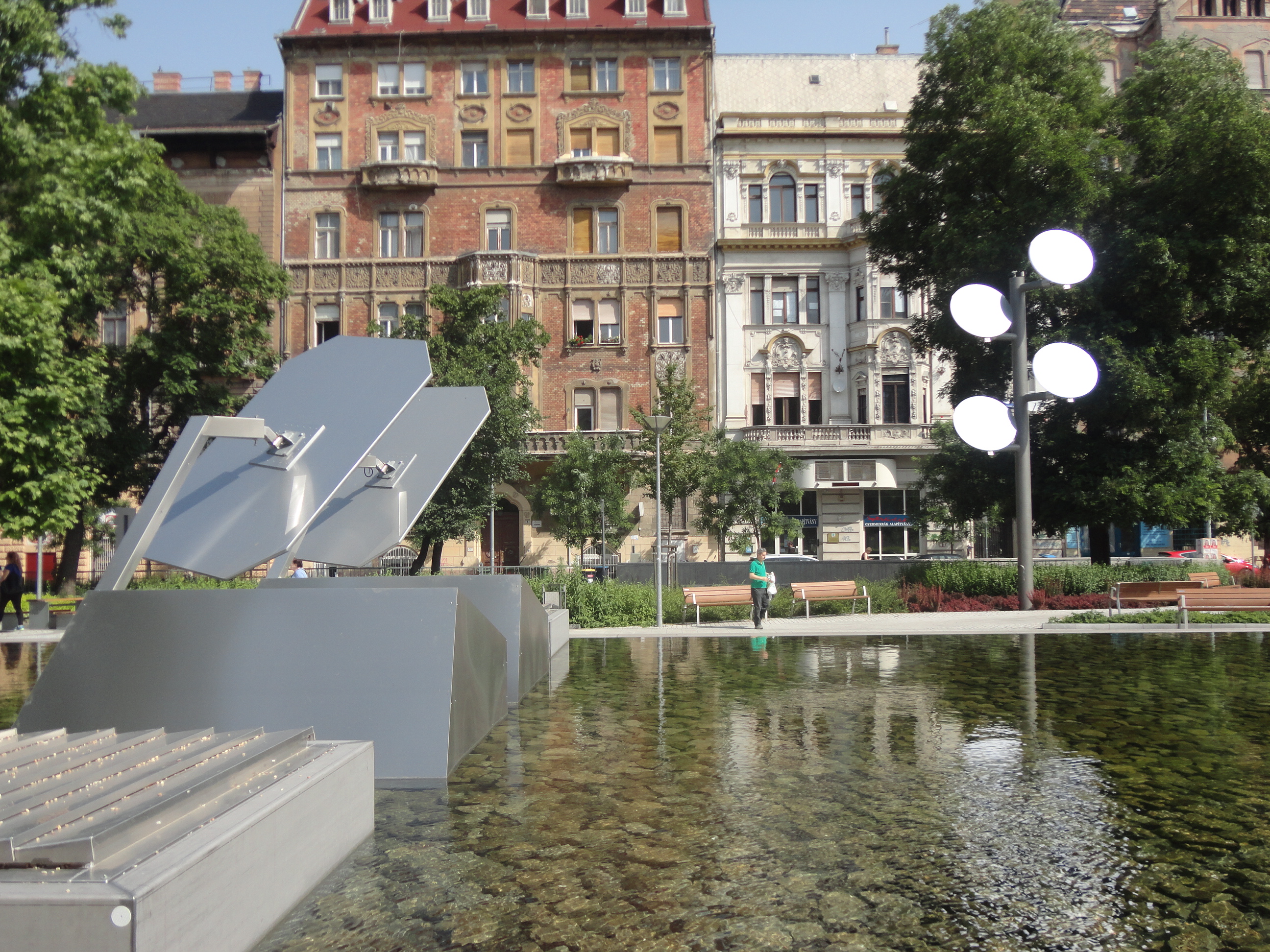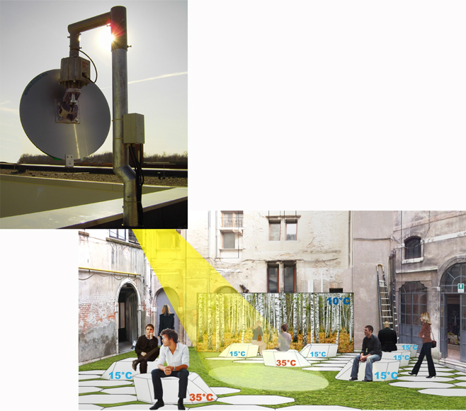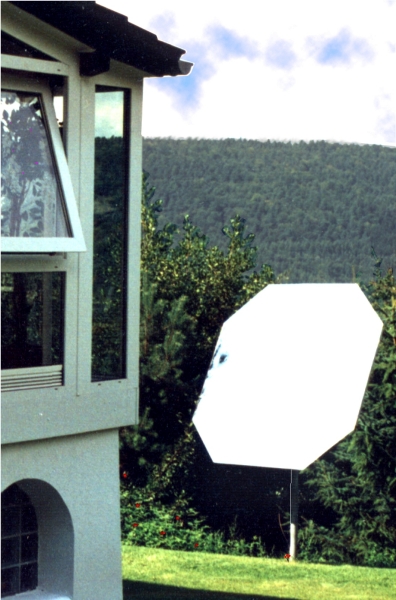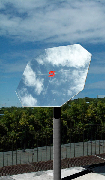 At the left you can see the Heliostat (1,6 m x 1,6 m). The sun reflex supplies the opposite sitting group. Alternative the reflex can be guided – through pushing a button – upon other targets, e. g. the lounger. Up to 50 such targets can be preprogrammed.