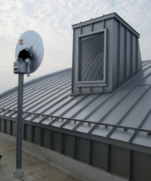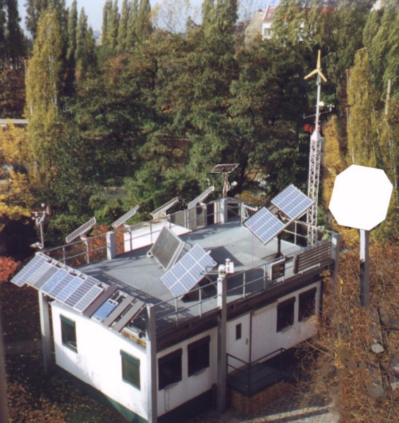 At the left side you can see the Heliostat of EGIS. It targets the sun light upon an optical prism (in the middle of the photo). The sun light is devided into its spectral colours and send from there to the solarpavillon (at the right side).