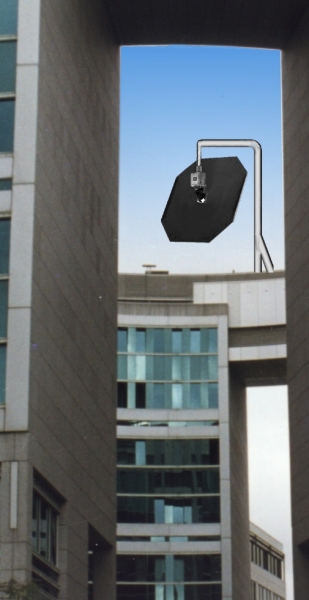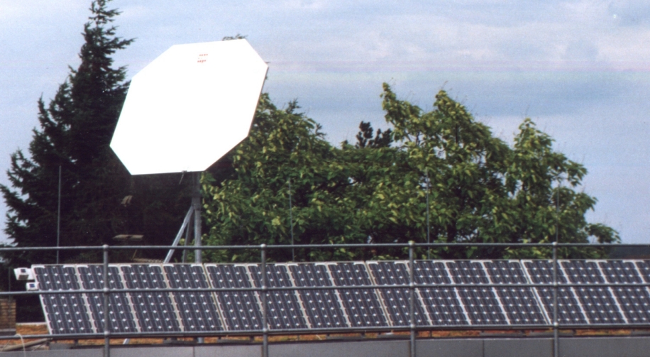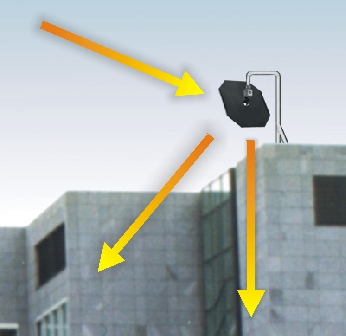 The light, unfortunately, hits this window in a very flat angle. You can see that in the downpipes shadow of the rain gutter and the light reflexes on the window pane (left). By this you may realize the high yield of light too. The light beams boundaries are clearly remarkable. Please respect the extreme long distance of 200 m. After every 20 seconds the shifting target reflex caused by the progress of the sun is set back to the target. This corresponds roughly to a correction angle of 0.1 degrees. The mentioned accuracy of 0.3 degrees represents a shift of only ca. 55 mm in a distance of 10 m, 0.5 m in 100 m distance and ca. 1 m in a distance of 200 m. The blurring effects at the borders of the sun reflex occur due to the dimensions of the sun disc with an aperture of about 0,5 degrees, therefor only minor parts are caused by the reflectors roughness. At lower distances the results are accordingly better.